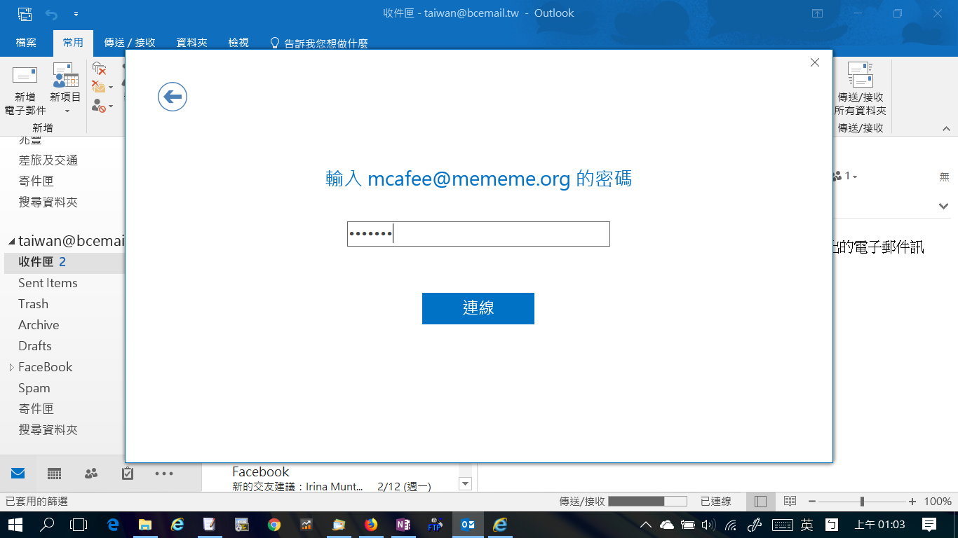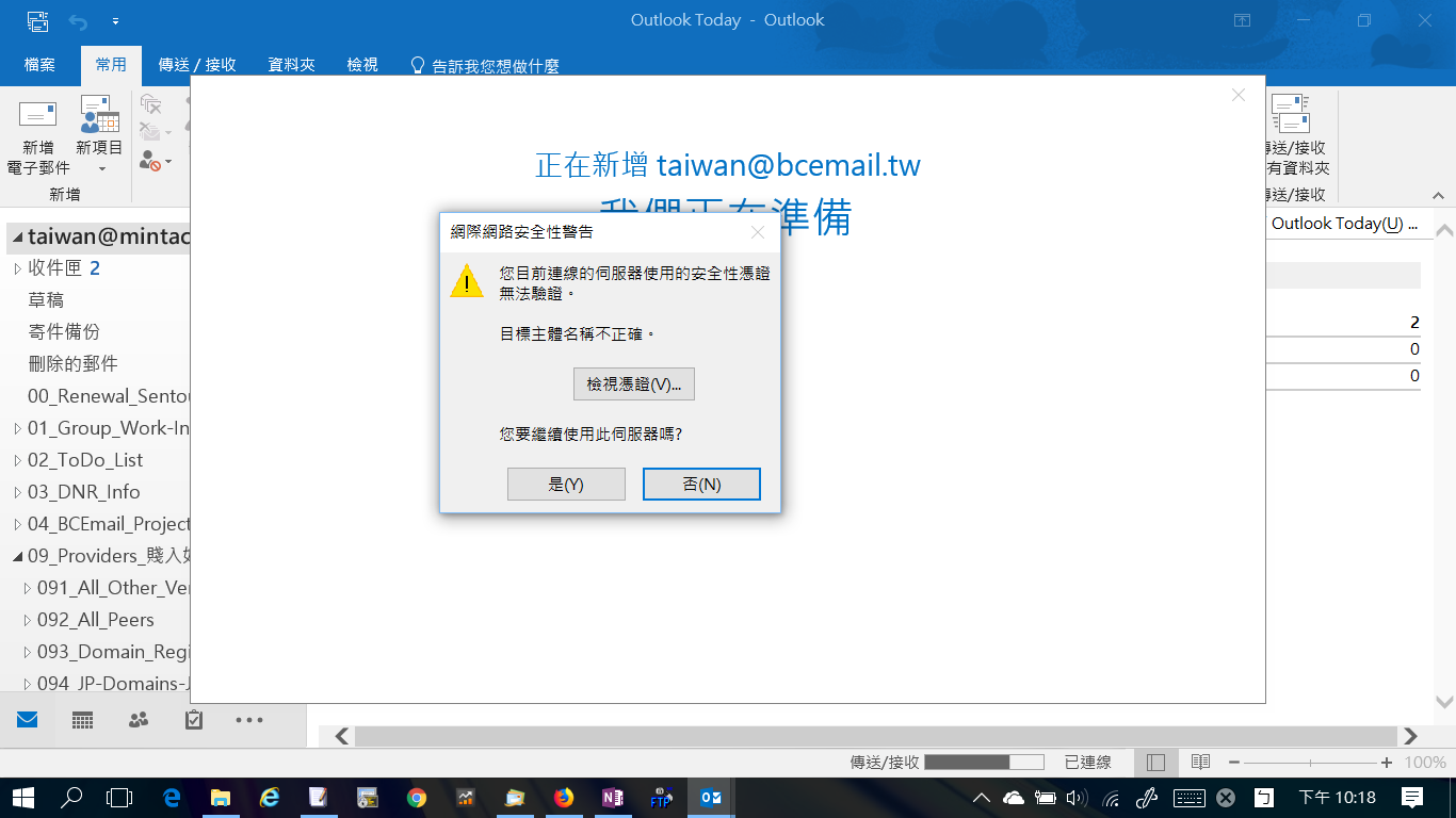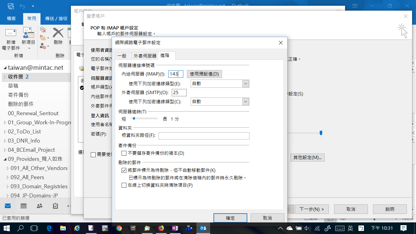 伺服器逾時設定:Outlook與郵件主機建立網路連線的時間超過這個值,就會給您無法連線的通知。如果網路連線常常很慢,請延長這個值。