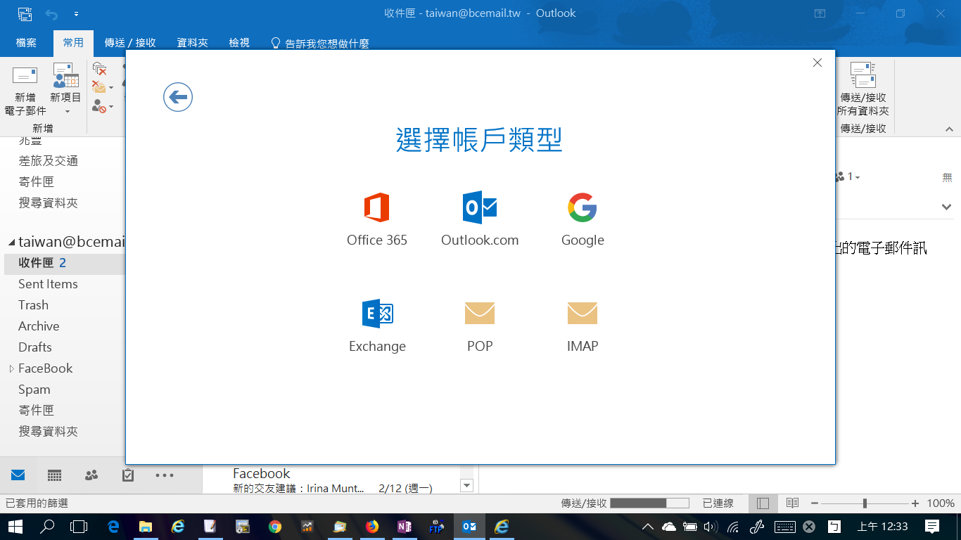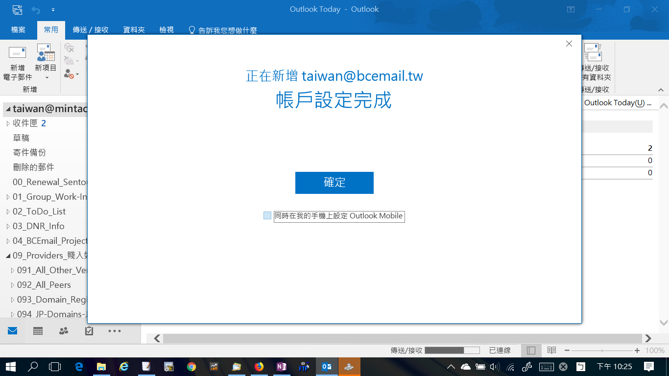 在您剛新增帳戶的收件夾裡,您會收到 Microsoft Outlook 測試您的「帳戶設定」所自動寄出的電子郵件訊息。