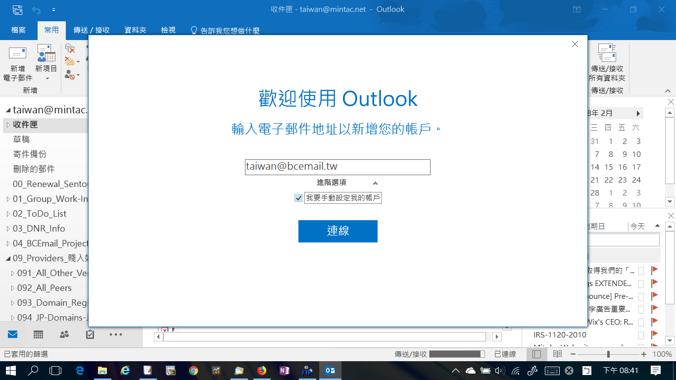 自動設定方法:Outlook 自動偵測您要新增的電子郵件地址的@右側部 (RHS) ,使用 IMAP 並採取SSL安全性設定。