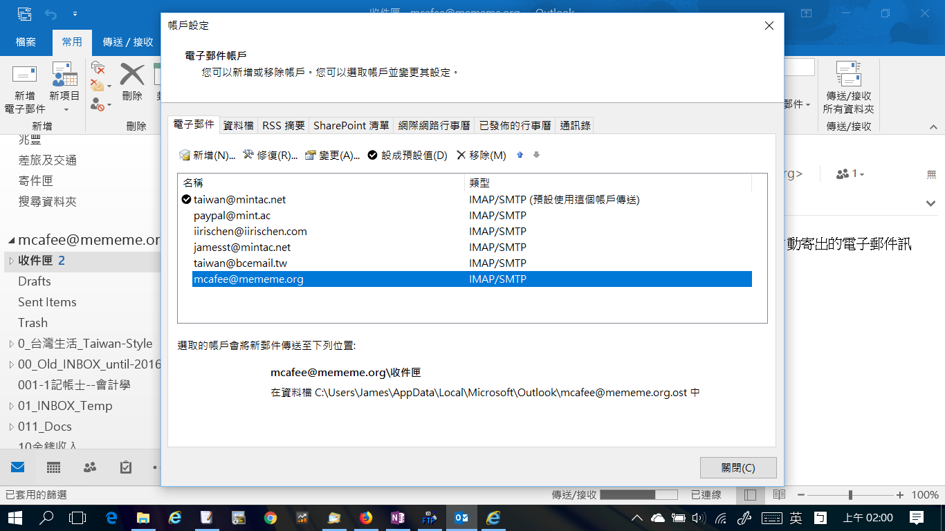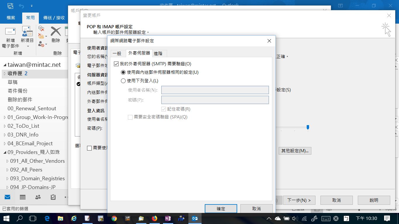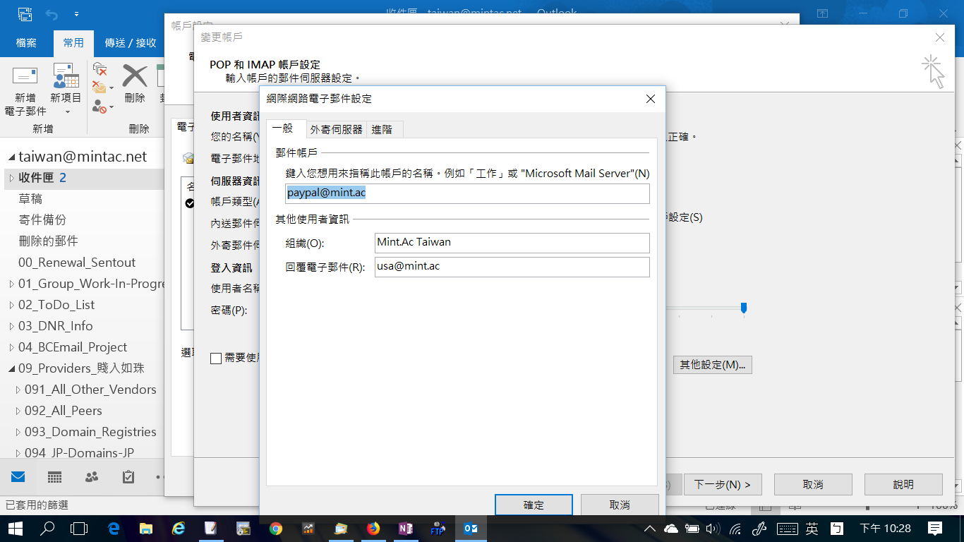 [啟動 Outlook]後,選取 [檔案] -> [資訊] 類別中,按「帳戶設定」方塊」,選「帳戶設定」選項。選取一個帳戶帳戶,按「變更」,開啟「網際網路電子郵件帳戶設定 」,按「其他設定」即可開啟「進階伺服器設定 」對話方塊。